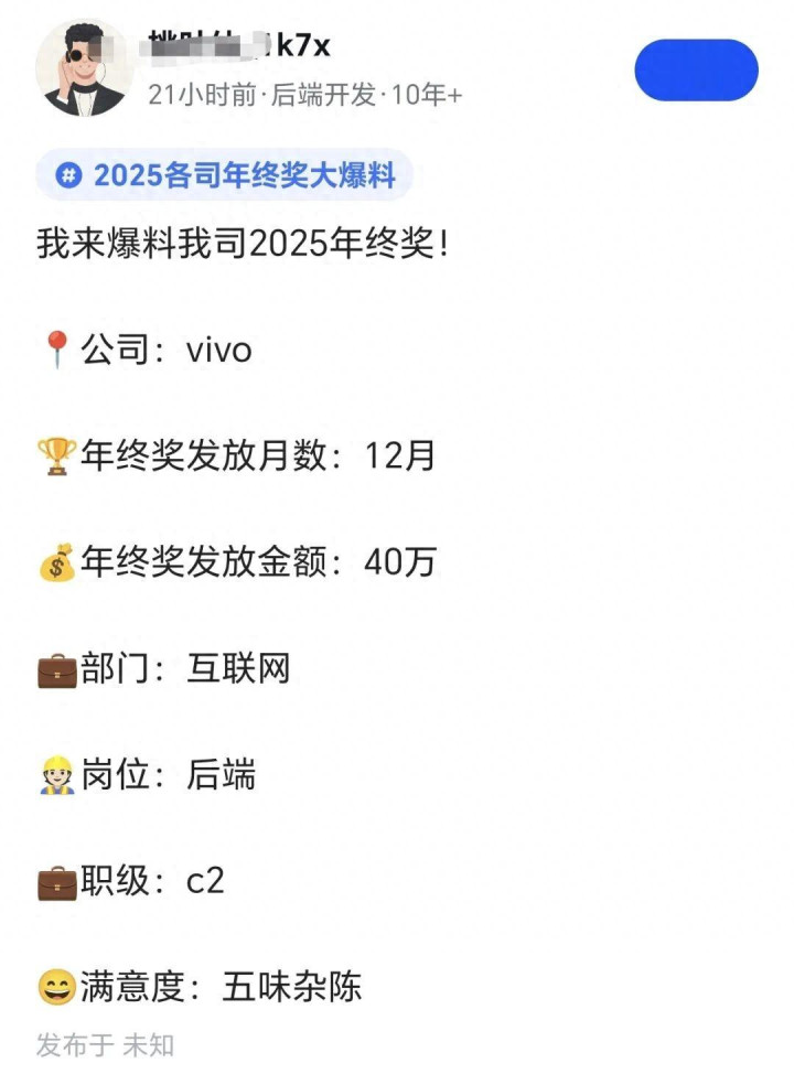 一位在 vivo 互联网部门、职级 C2 的后端开发岗员工,在某职场社交平台晒出了他 2025 年的年终奖,总共有40W,相当于 12 个月工资。